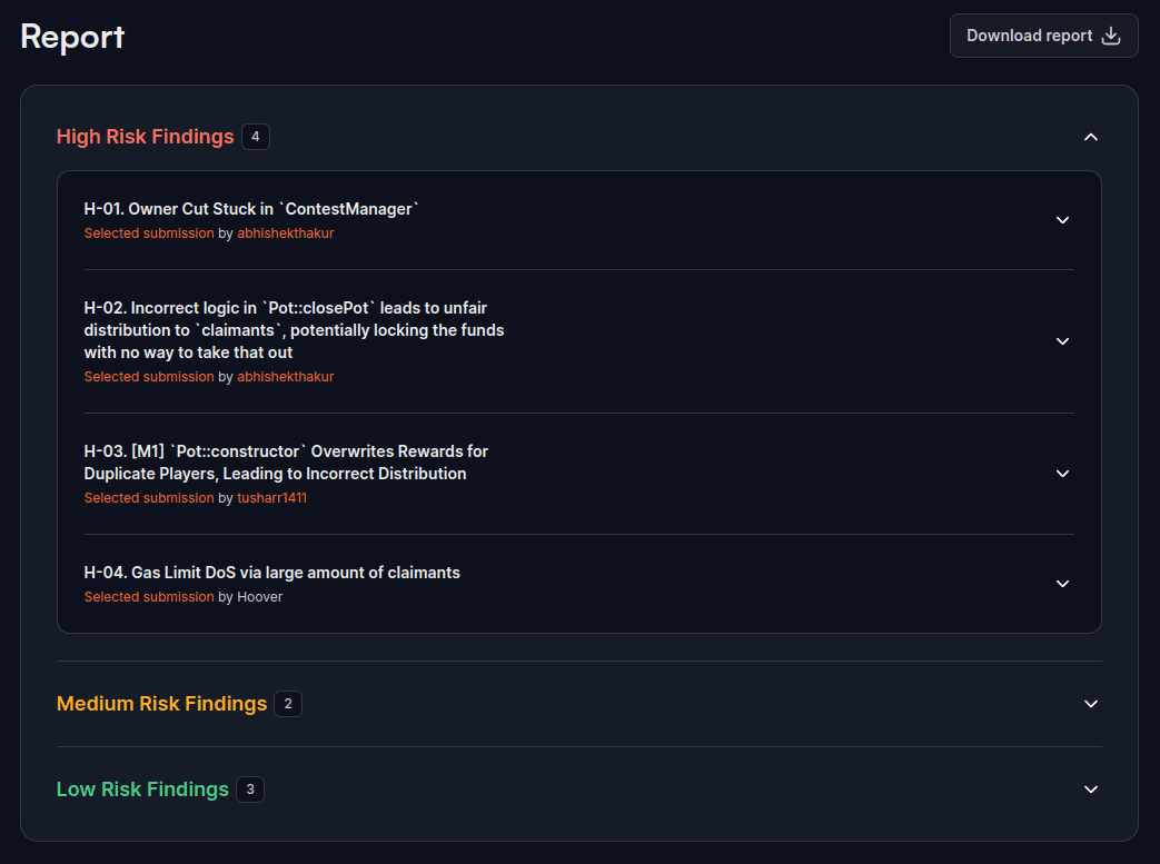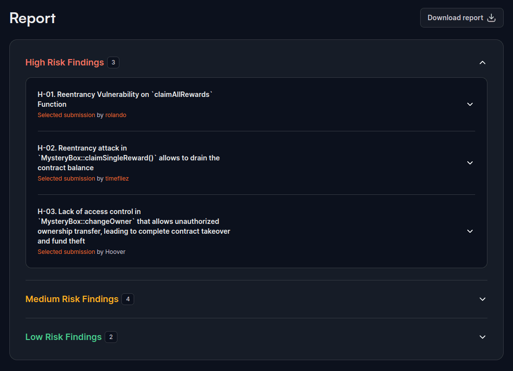 After the first contest, I tried another First Flight. This time I also found a couple of high-severity vulnerabilities, and decided to submit them. This time 654 valid bug submissions were made to the contest, 112 of which identified the same high-severity vulnerability as me, and my submission was the one selected for the final report.